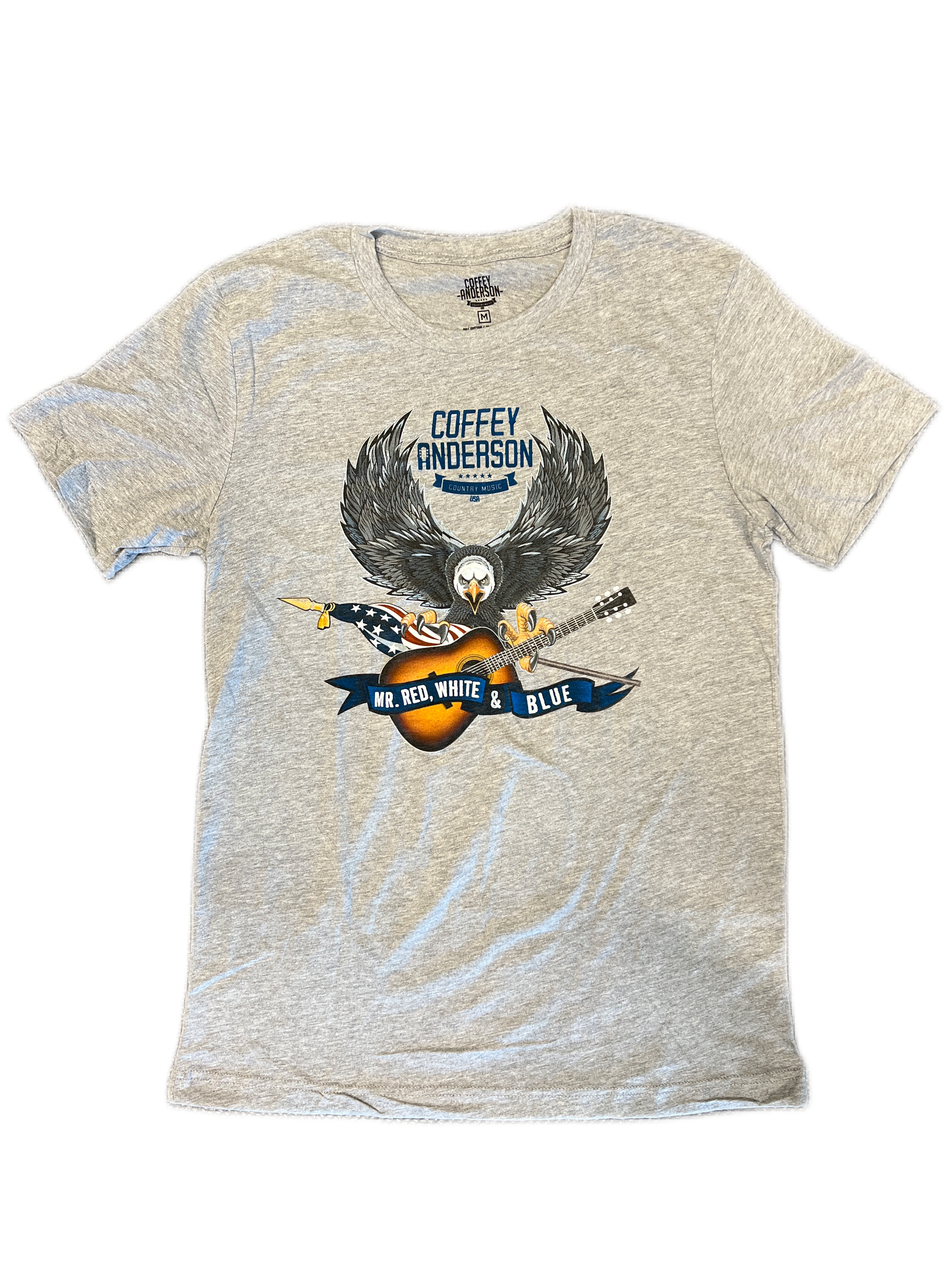 The standout feature of this tee is the eye-catching screen print design on the front, featuring an eagle soaring through the air and the inspiring words "Mr. Red White and Blue" from the breakout patriotic country song.